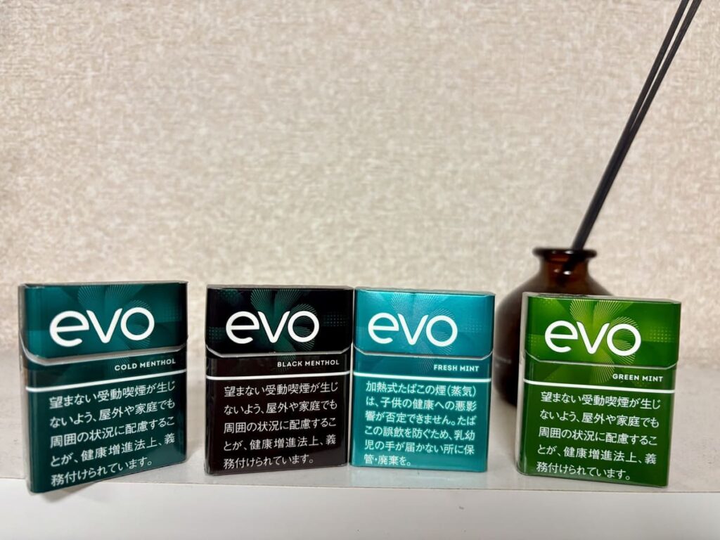 | ・エボ ブラック メンソール ・エボ コールド メンソール ・エボ フレッシュ ミント ・エボ グリーン ミント(本記事で紹介) |